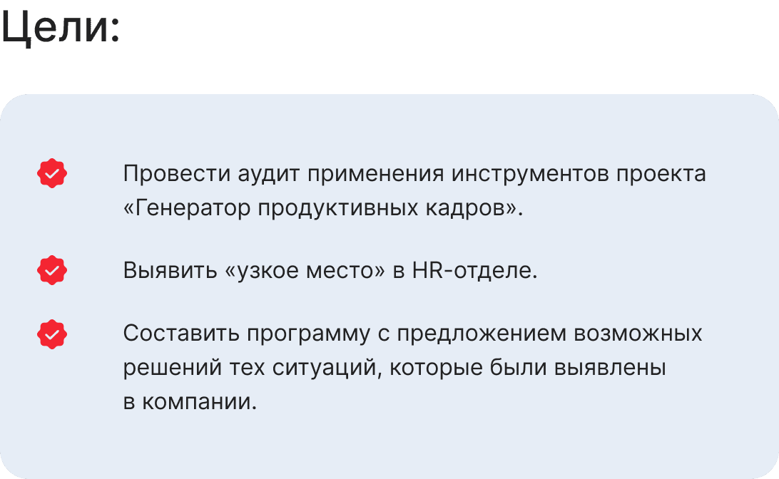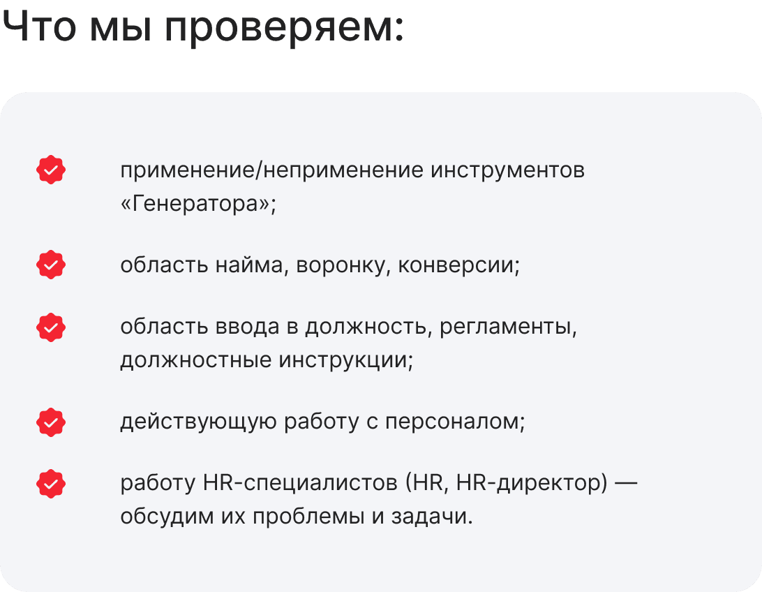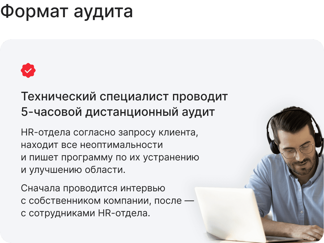 Воспользуйтесь индивидуальным аудитом вашего департамента персонала от Людмилы Шабаевой с последующим сопровождением. |